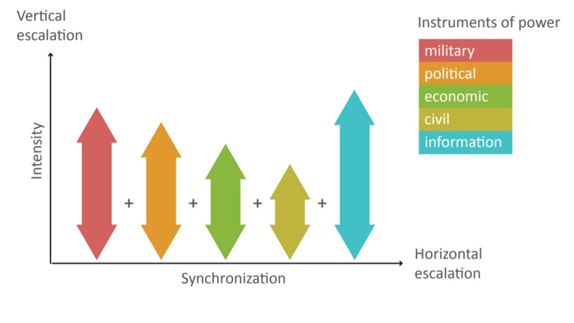 Het is belangrijk om in te zien dat meerdere machtsinstrumenten gebruikt worden in meerdere dimensies en op verschillende niveaus tegelijk op een synchrone manier. Dit staan de actor toe om verschillende MPECI (Militair, Politiek, Economisch, Civiel, Informatie) middelen te gebruiken die ze te beschikking hebben om synchrone aanvalspakketten te creëren die op maat zijn van opgemerkte of vermoedde kwetsbaarheden. De machtsinstrumenten die gebruikt worden zullen afhangen van de mogelijkheden van de actor en van deze kwetsbaarheden, alsook van de politieke doelstellingen van de actor en zijn geplande weg om zijn doelen te bereiken. Zoals in alle conflicten met oorlogen, zal het karakteristieke van de hybride oorlogsvoering afhankelijk zijn van de context.